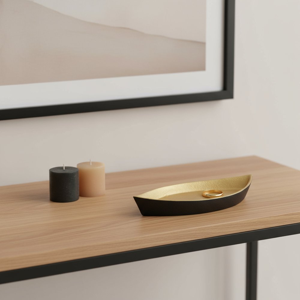 Crafted from premium cast iron, this chic two-tone dish showcases an eyeball or boat shape that adds a unique and stylish touch to any decor. The modern style is enhanced by a beautiful black and gold coloration, making it a versatile addition to your home. Each piece is meticulously handmade, ensuring that it is not only functional but also a work of sculptural art unto itself. The rough hewn distressed finish gives it a charming, vintage appeal, allowing it to blend seamlessly with both contemporary and traditional interiors. Use it to elegantly organize your small treasures or as a captivating centerpiece on your coffee or console table. Makes a great catch-all. Use it to store jewelry, keys, or simply as an exquisite display item. 1.25-inch h x 9.75-inch w x 4.25-inch d.