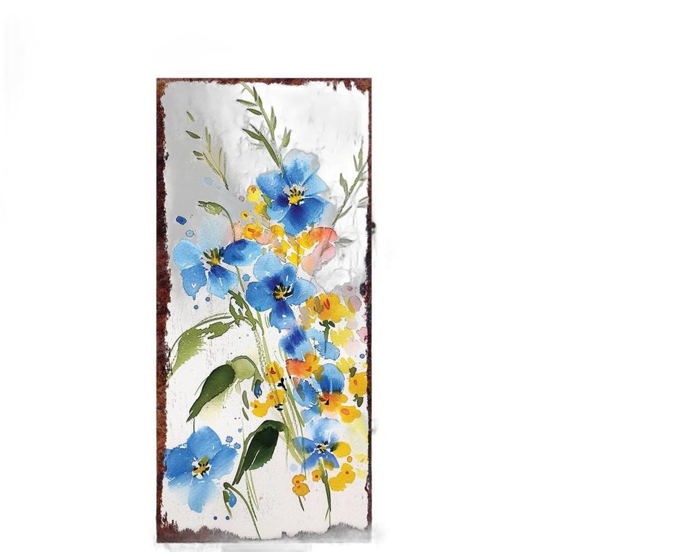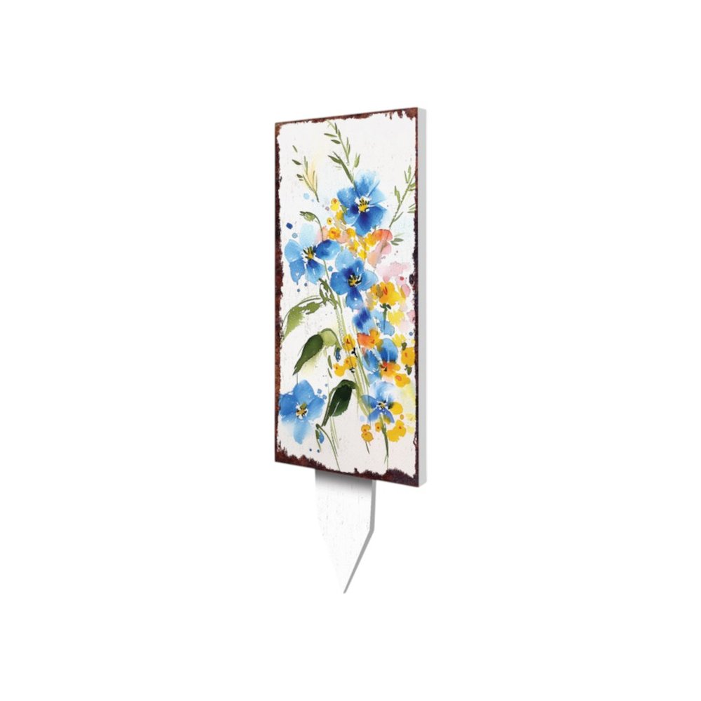 The 10-inch blue white and yellow solid wood wildflowers garden stake is a charming addition to your outdoor space. Crafted from solid wood, this garden stake showcases a traditional design that enhances any garden or patio setting. The vibrant colors of blue, white, and yellow create a cheerful focal point, making it an ideal accessory for flower beds or potted plants. This durable stake not only adds beauty but also serves as an eye-catching marker in your garden. Bring a touch of nature's artistry to your home with this delightful piece, perfect for gardening enthusiasts and those looking to elevate their outdoor décor. Enjoy the perfect blend of style and functionality with this enchanting garden stake. 10-inch h x 26-inch w x 0.5-inch d.