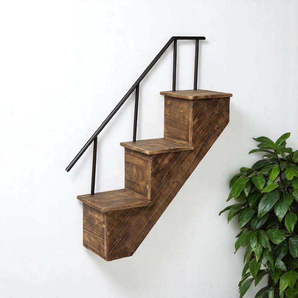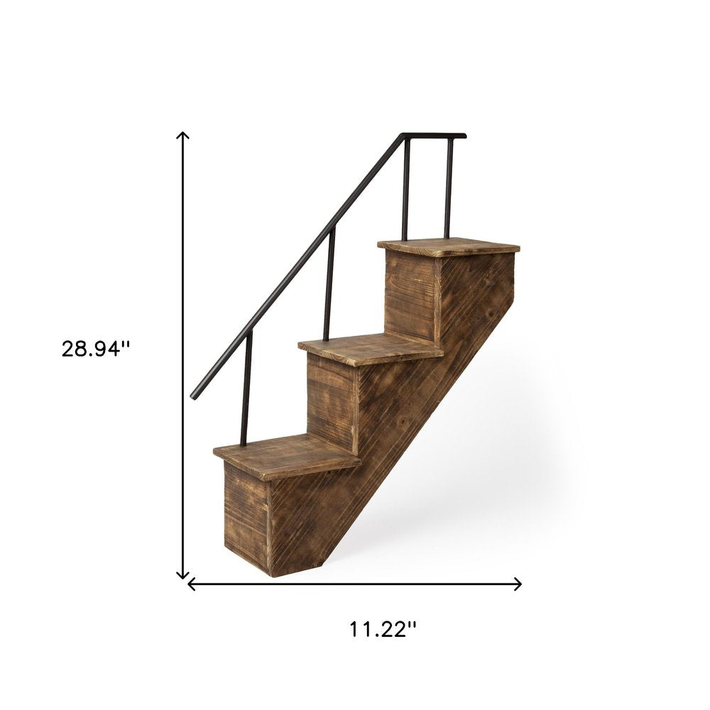 The 11-inch brown metal and solid wood novelty wall mounted accent shelf is a stylish addition to any living room. Crafted from a blend of metal and solid wood, this shelf combines durability with a unique and eye-catching stairway design. Its modern industrial style complements a variety of decor themes while adding a touch of rustic sophistication. This accent shelf not only offers a practical space-saving solution but also serves as a decorative element that elevates your interior space. Perfect for displaying books, plants, or photos, it transforms any wall into a functional focal point that reflects your unique style. 28.94-inch h x 11.22-inch w x 6.9-inch d.