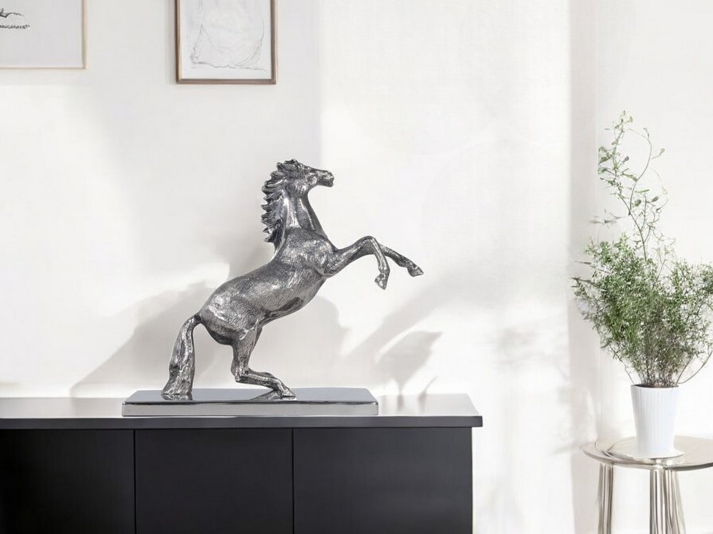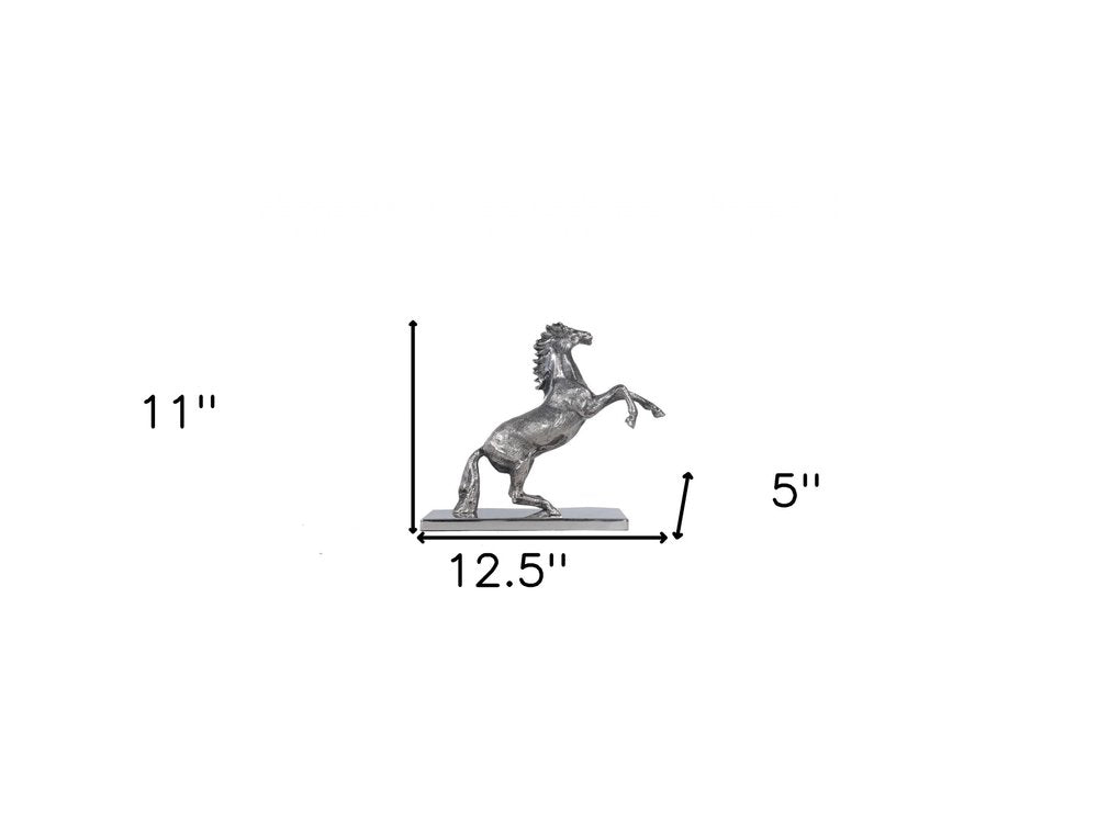 This 11-inch nickel metal hand painted figurine tabletop sculpture will add a beautiful decorative accent to your decor. High-quality metal used in this nickel sculpture is both good looking and hard wearing. It's a perfect addition for those who love an up-to-the-minute look and feel. 11-inch h x 5-inch w x 12.5-inch d.