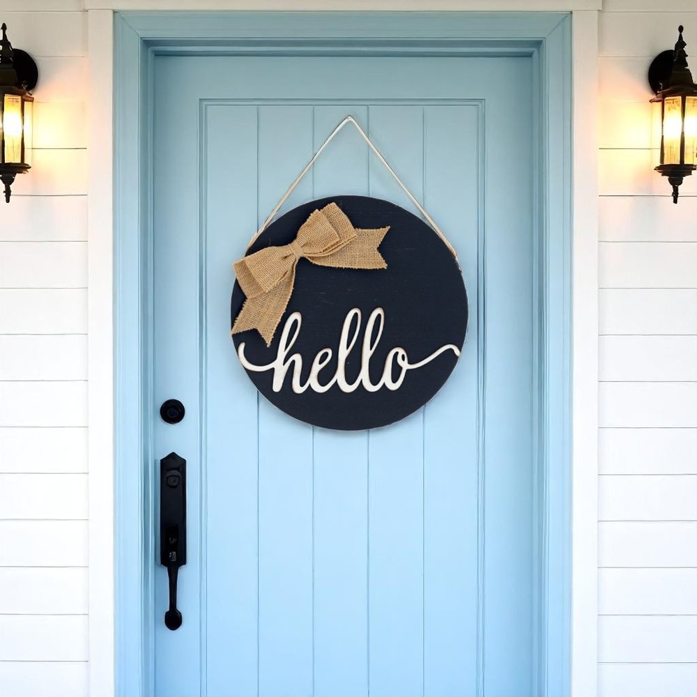 The 12-inch black hello and welcome solid wood reversible hanging wall or door decor adds a charming touch to any outdoor space. Crafted from solid wood, this piece combines durability with a classic look. Its traditional style ensures it fits seamlessly into various design themes, enhancing the overall aesthetic of your garden or entrance. The striking black color offers a bold statement that draws attention and welcomes guests. Perfect for hanging on walls or doors, this versatile decor item can be easily switched to display either "hello" or "welcome," making it a functional yet decorative addition to your outdoor accessories. Reversible design allows you to change up the look with two different designs - one side says "Hello" and other "Welcome". 12-inch h x 12-inch w x 1-inch d.