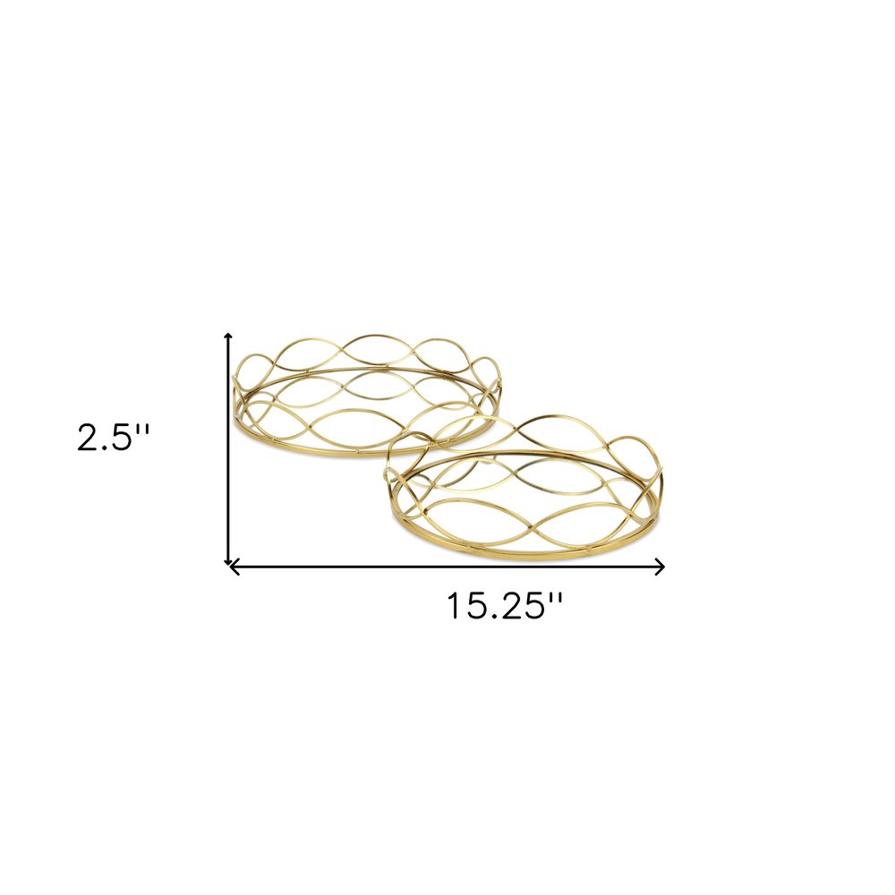 This 15" gold round metal handmade tray with handles will add a beautiful decorative accent to your decor. Made from metal, this durable round tray is perfect to use as serveware or as a showcase for other objects just as beautiful as it is. Features handles for quick and easy transportation. This tray has a food safe finish. 2.5" H x 15.25" W x 15.25" D