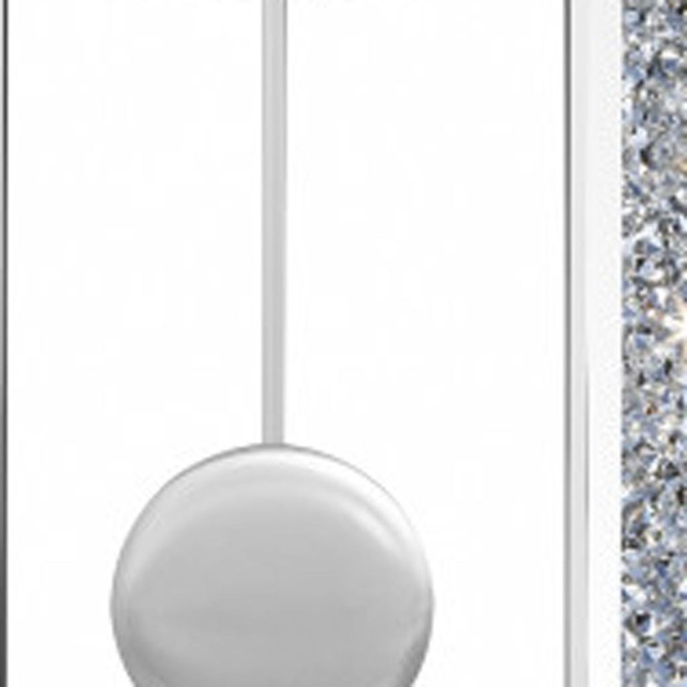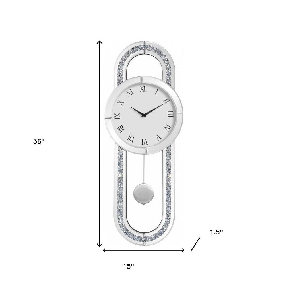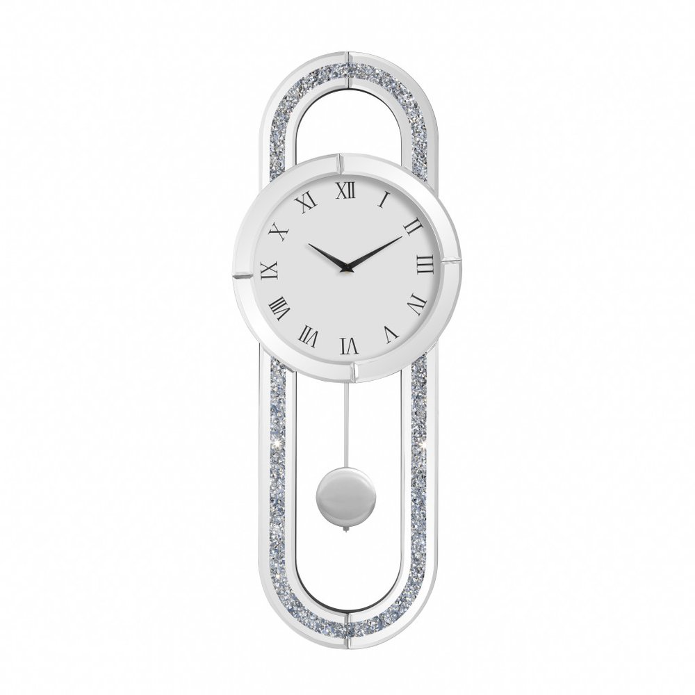 This 15-inch silver faux crystal and mirrored glass silent analog oval wall clock includes three moving hands on the face that move smoothly to indicate the hour, minute and seconds. The oval shape of this clock frame includes a round clock face in the center. The white round clock face is made from sturdy MDF and features roman numerals. The surrounding oval frame is crafted from a stunning mix of mirrored glass and faux crystal bling. The eye-catching design of this clock will ensure that you never run late again. 36-inch h x 15-inch w x 1.5-inch d.