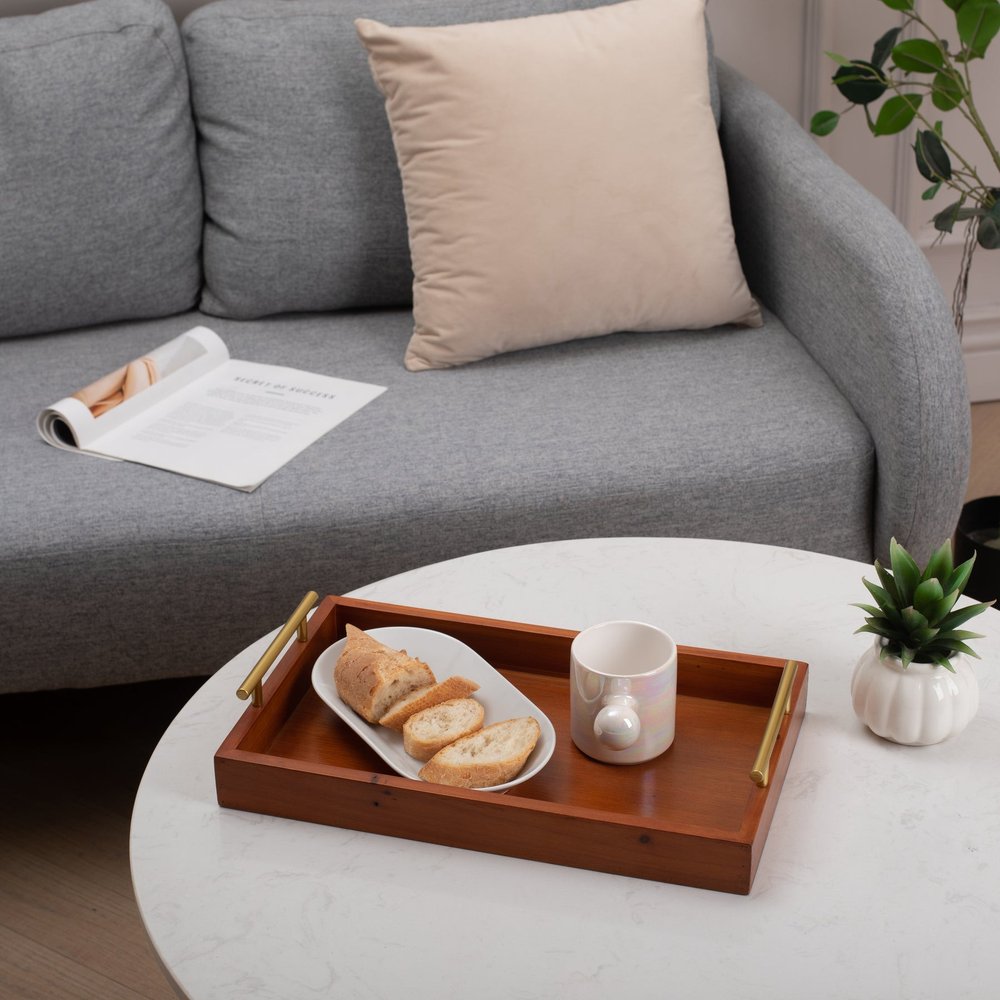 This 16-inch brown and gold solid wood handmade serving tray with handles is beautiful enough to be left out on the counter or shelf when not in use. This stylish and versatile tray is practical and good looking to sit out as display all year long. Features handles for quick and easy transportation. Intended for decorative, non-direct food contact use only, it's perfect for displaying a collection of candles, perfume, décor, and more. 3-inch h x 15.5-inch w x 9.5-inch d.