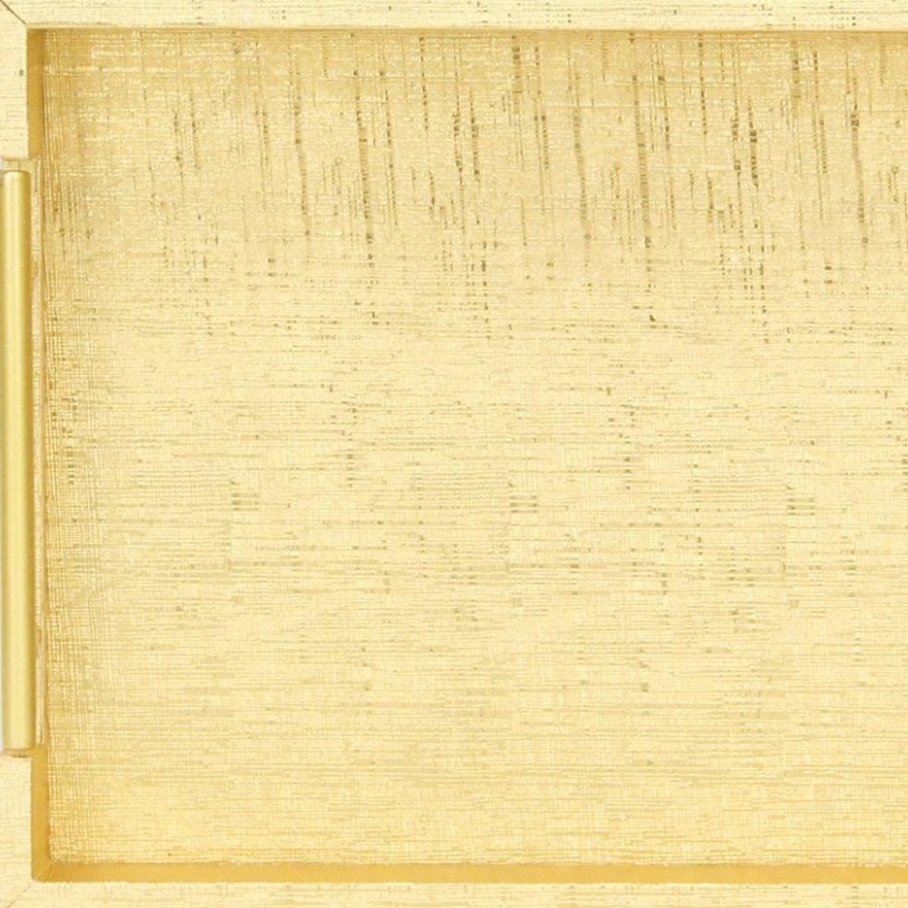 This 16-inch gold wood and vinyl geometric handmade serving tray with handles is a handy and versatile addition to your home. A beautiful geometric pattern adds to the appeal and decorative quality of this piece. Designed with handles for easy transport and convenience. Intended for decorative, non-food use only, it's the perfect decorative accent piece. 1.75-inch H x 15.75-inch W x 9.5-inch D