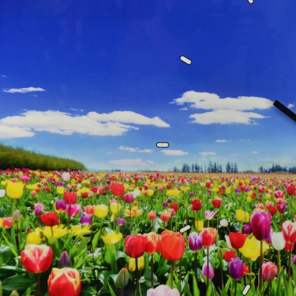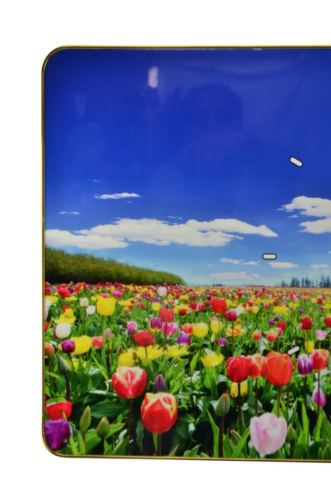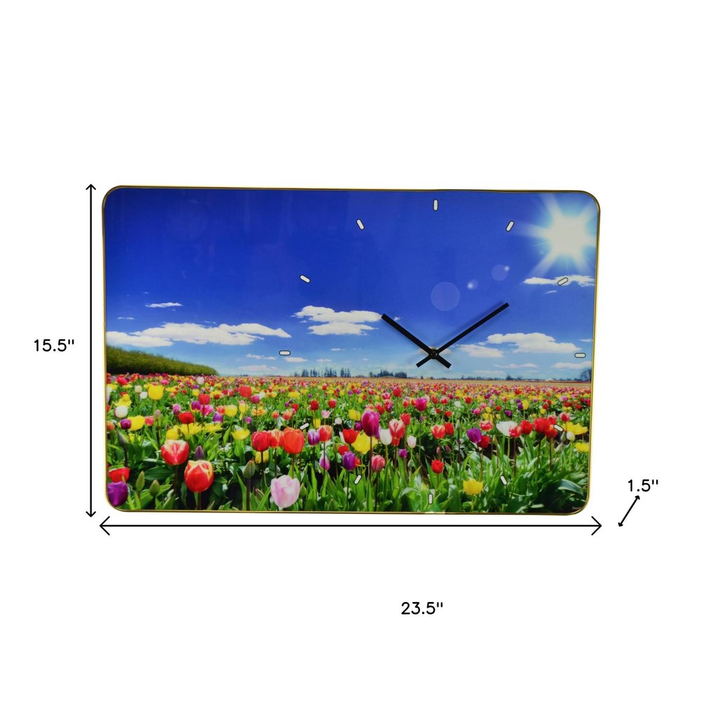 This 24-inch blue red and gold solid wood and acrylic silent tulips floral wall clock includes three moving hands on the face that move smoothly to indicate the hour, minute and seconds. Features a practical, curved-edged rectangle shape and a vibrant field of tulips design. The clock face not only looks good but is made from sturdy acrylic that will stand the test of time. Elevate the decor of any room in your house. With its unique design and practical purpose, this clock will add flair to your home while also acting as an essential tool. 15.5-inch h x 23.5-inch w x 1.5-inch d.