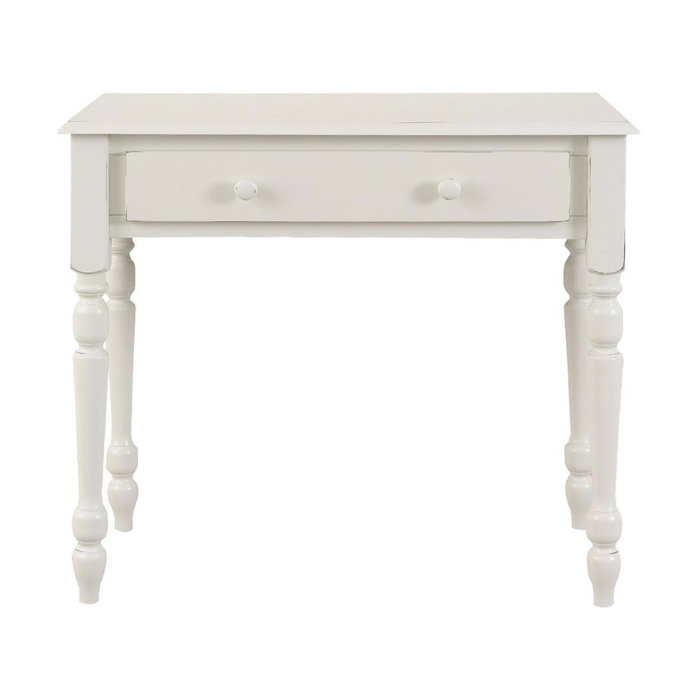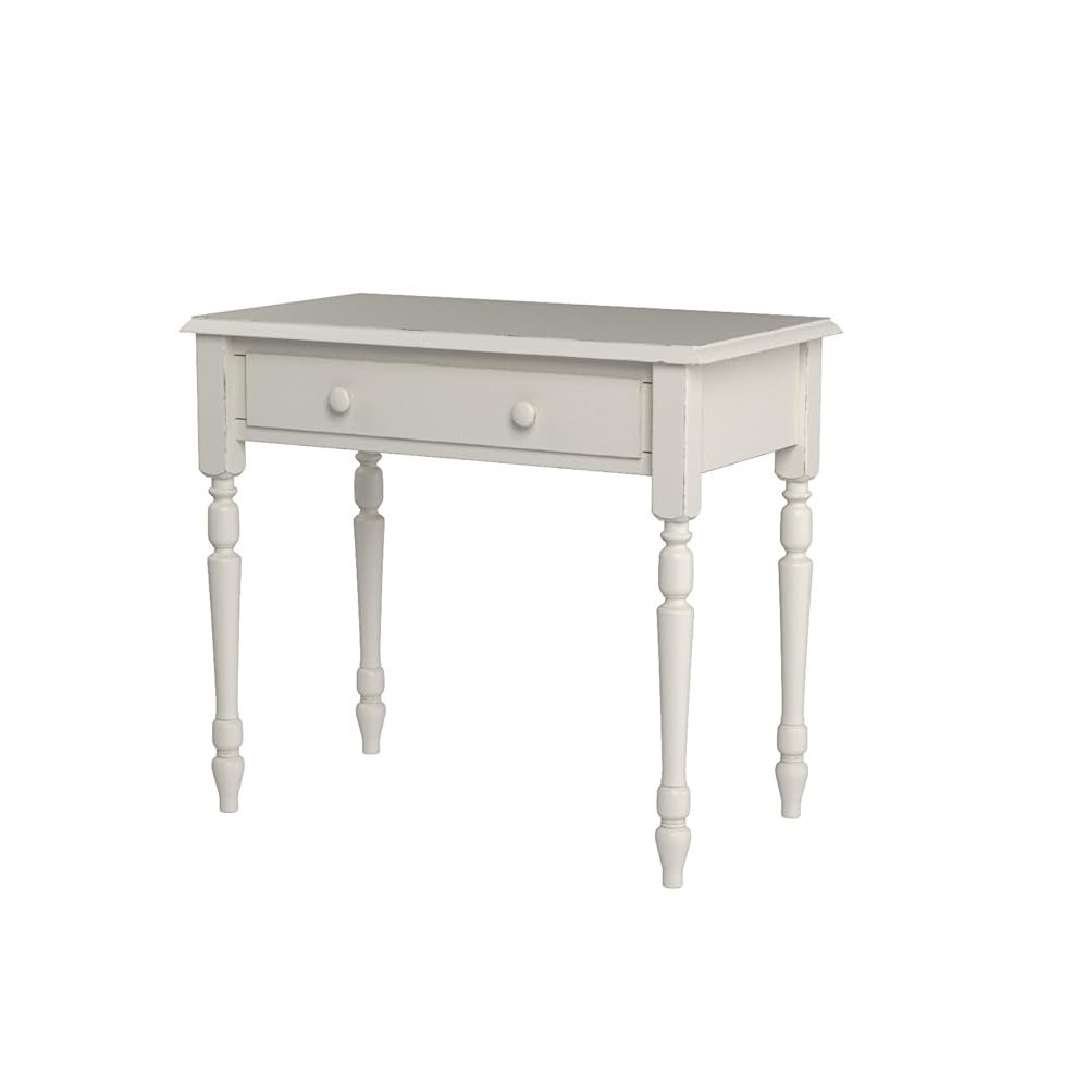 This 34-inch off white solid wood writing desk will bring classic design and styling to your living room, home office or bedroom. Designed to easily fit into most spaces, this classically shaped rectangular desk will turn your room into a productive workspace. A single drawer gives this desk some hidden storage for your office essentials. Built to last, this sturdy desk is designed for comfort and efficiency for years to come. 30-inch h x 34-inch w x 19-inch d.