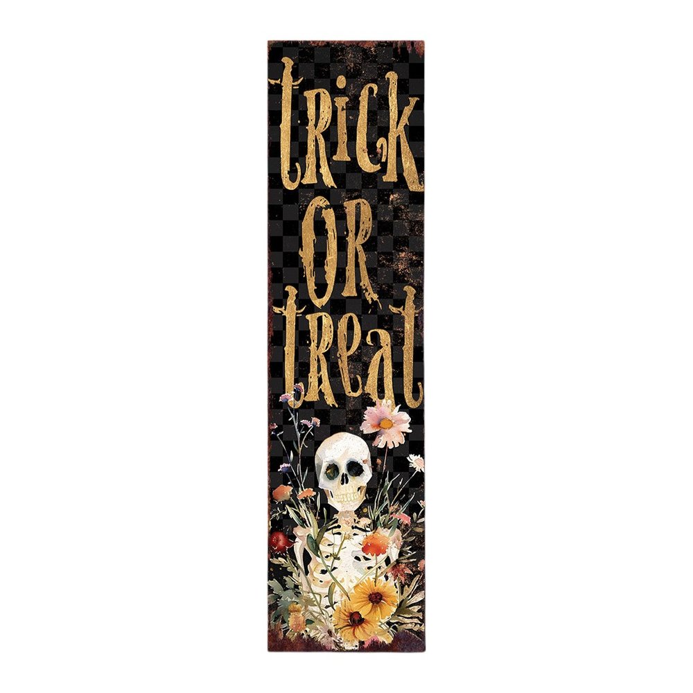 36-inch black and gold solid wood trick or treat halloween skeleton porch sign is the perfect way to welcome seasonal festivities. Crafted from durable solid wood, this traditional porch sign showcases a striking color scheme and creates a welcoming and festive atmosphere to your outdoor space. The charming skeleton design is sure to delight trick-or-treaters and guests alike. Enhance your home’s curb appeal with this decorative accessory that beautifully captures the spirit of the season. This versatile piece can easily complement various styles while making a memorable statement on your porch during the autumn months. 36-inch h x 11-inch w x 1-inch d.