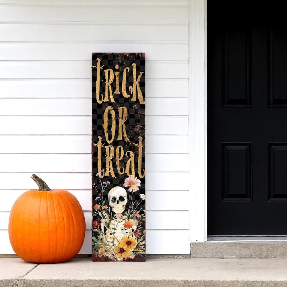 36" Black And Gold Solid Wood Trick or Treat Halloween Skeleton Porch Sign