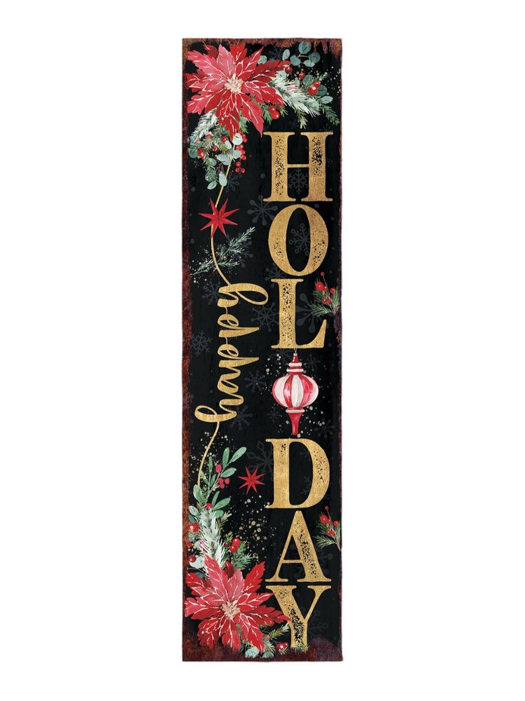 The 36-inch black gold green and red solid wood happy holidays christmas poinsettia porch sign adds a festive touch to your outdoor decor. Crafted from solid wood, this sign showcases a traditional style that complements any winter setting. Featuring an elegant design adorned with vibrant colors of black, gold, green, and red, it creates a warm and welcoming atmosphere for guests. Perfect for enhancing your porch during the holiday season, this accessory is an ideal way to celebrate christmas and spread holiday cheer. Its durable construction ensures it will last for many seasons to come, making it a cherished addition to your festive decorations. Make your home inviting with this charming garden game piece. 36.00-inch h x 11.00-inch w x 1.00-inch d.