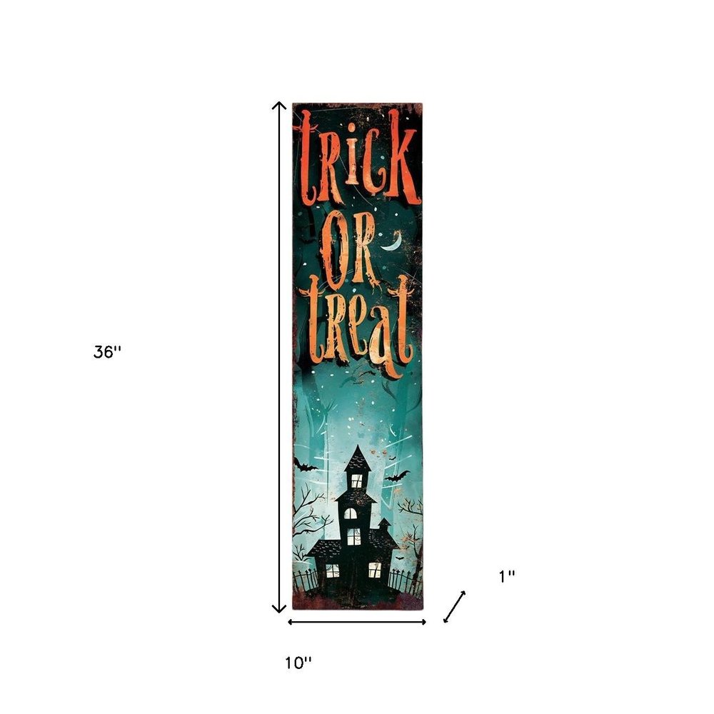 The 36-inch black orange and green solid wood trick or treat halloween porch sign is the perfect outdoor accessory to enhance your seasonal decor. Crafted from sturdy solid wood, this traditional-style sign adds a charming touch to your Halloween festivities. Its vibrant colors of black, green, and orange create a striking contrast that will catch the eye of trick-or-treaters. Ideal for adding a festive flair to your porch, it showcases the spirit of fall with a playful yet classic design. This porch sign is ideal for those who appreciate quality craftsmanship and want to make a lasting impression during the Halloween season. Elevate your outdoor decor with this delightful piece that celebrates the fun of halloween. 36-inch h x 10-inch w x 1-inch d.