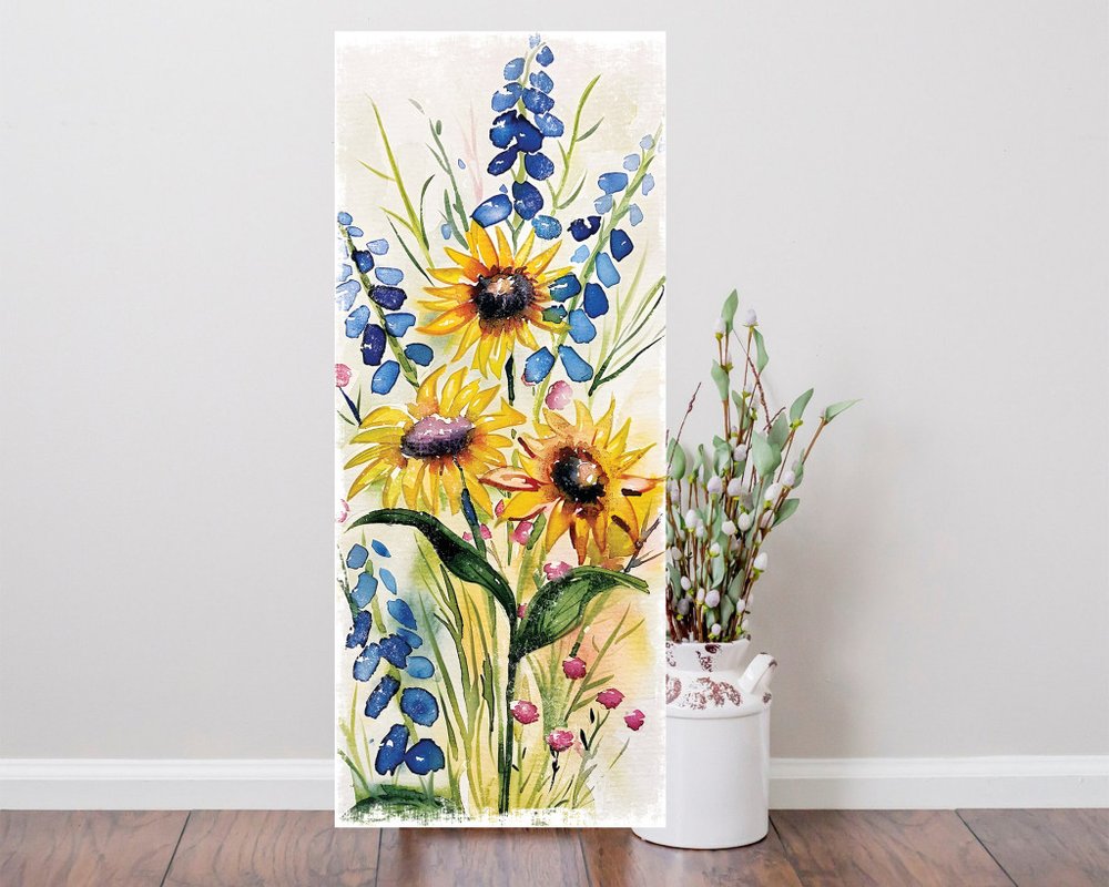 The 36-inch blue green white and yellow solid wood sunflowers porch sign is a charming addition to your outdoor space. Crafted from durable solid wood, this porch sign showcases a beautiful traditional style that complements any space. Its vibrant colors bring a lively and inviting touch to your entrance. The pretty watercolor sunflower design captures the essence of nature, making it an eye-catching feature in any setting. Elevate your decor with this delightful sign that combines functionality with artistic appeal. 36-inch h x 11-inch w x 1-inch d.