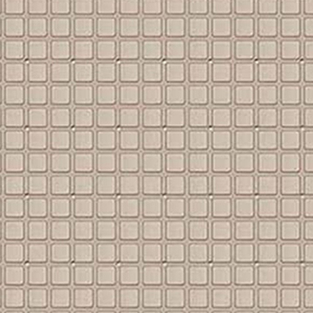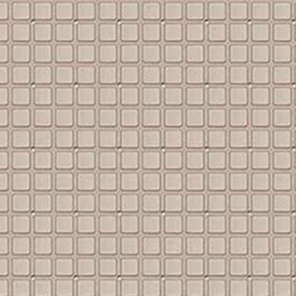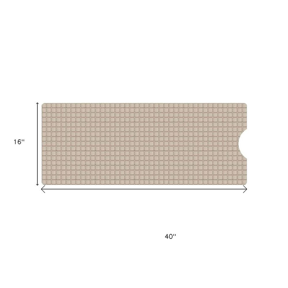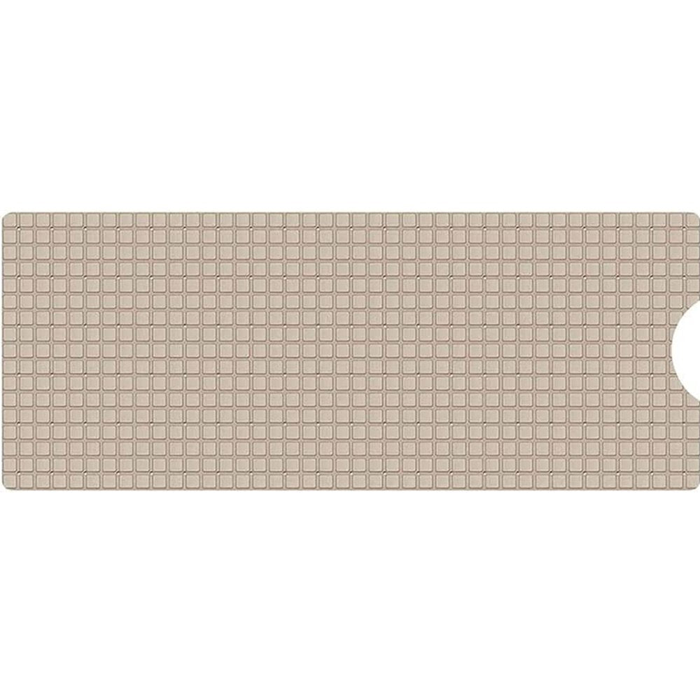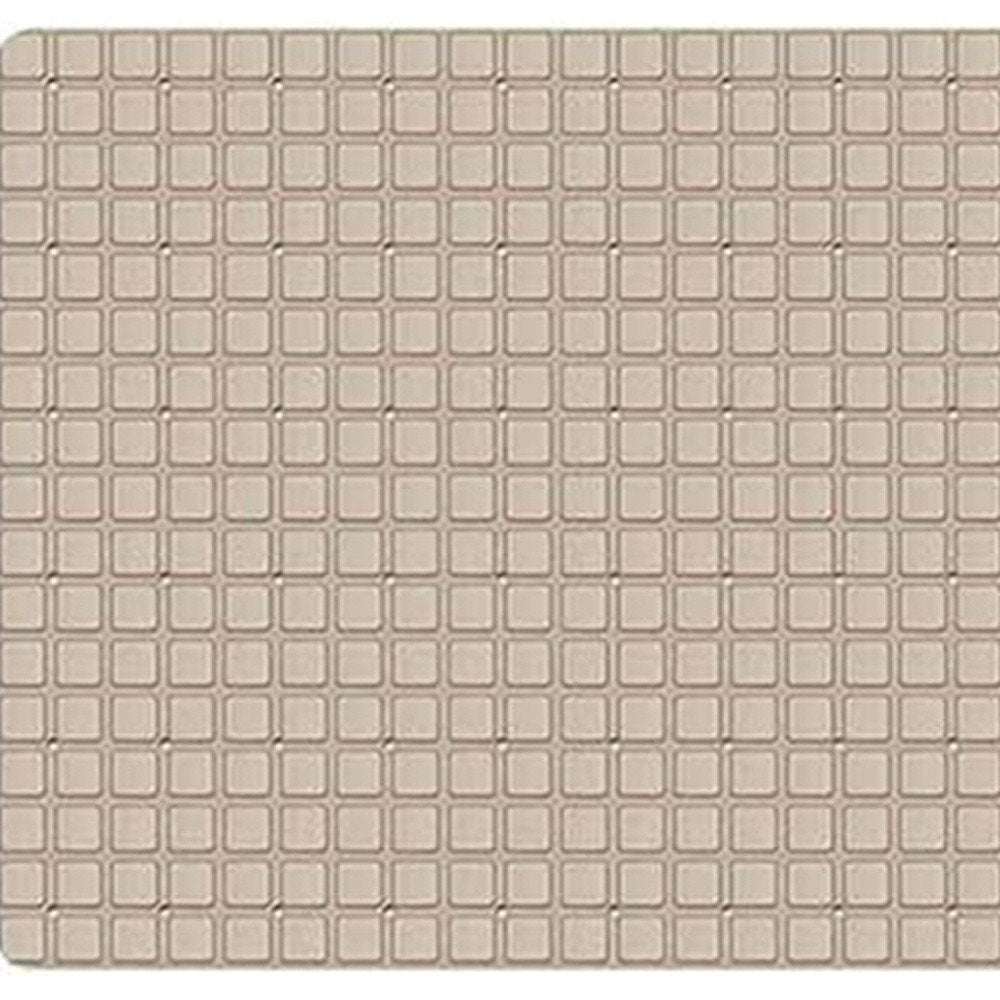 Add comfort and safety to your bath with this good looking and practical 40-inch beige geometric tiles non slip bathtub mat. Designed with many small squares that resemble a keyboard, the soft surface also includes circular holes for drainage. Prevent slipping and sliding in the bath with this sturdy and long lasting easy to clean and maintain mat. There are 200 suction cups underneath the comfortable surface that help keep this mat in place for safer baths and showers. 16-inch h x 40-inch w x 0.3-inch d.