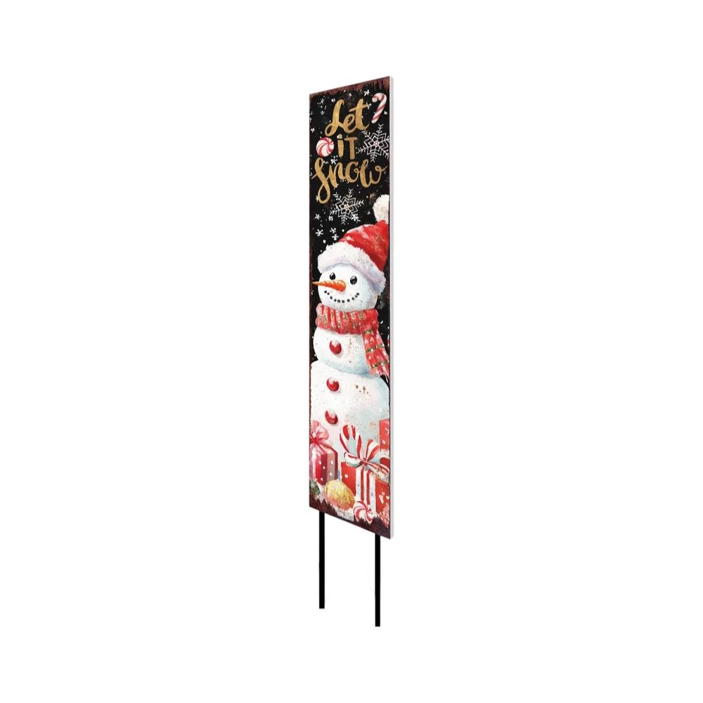 The 42-inch black white red and gold let it snow snowman solid wood garden stake is a delightful addition to your outdoor accessory collection. Crafted from solid wood, this garden stake showcases a traditional design that enhances any yard. Its cheerful colors of black, white, red, and gold create a festive atmosphere, making it perfect for the christmas season. This charming stake not only serves as a decorative piece but also brings joy to your garden while welcoming guests during holiday gatherings. Ideal for those who enjoy blending festive spirit with outdoor decor, this garden stake is sure to become a cherished part of your seasonal decorations. Enhance your outdoor space with this whimsical and eye-catching design. 42-inch h x 7-inch w x 1-inch d.