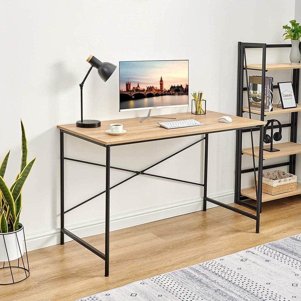 This 47-inch natural and black wood and metal computer desk will help to turn your office space into an executive suite. Designed to easily fit into most spaces, this classically shaped rectangular desk will turn your room into a productive workspace. Forged with premium craftsmanship and design, this desk is built to last. 29.6-inch h x 47.2-inch w x 23.6-inch d.