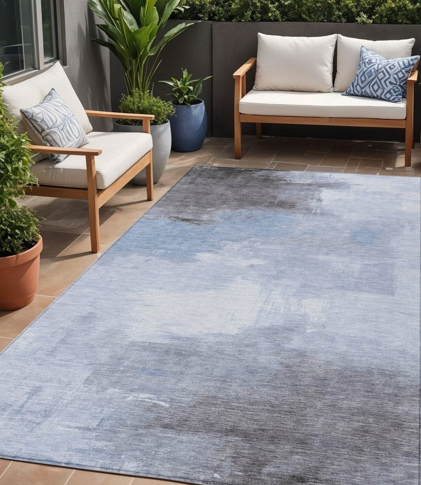 This 5-foot x 8-foot sky blue gray and ivory abstract washable indoor outdoor area rug, is a great way to add warmth to a room. This rectangle shaped rug features a abstract design that will work well both indoors or out. A classic shape marries with good looking design for your living room, hall, bedroom, porch, patio, or poolside. Ideal for outdoor spaces or high traffic areas with kids and pets, this rug is made from heavy duty polyester that is stain resistant to help repel water, dirt, and stains. Versatile in use, durable, and easy to maintain, this rug is an ideal solution to add a decorative and inviting touch to your indoor or outdoor space. 60-inch h x 90-inch w x 0.19-inch d.