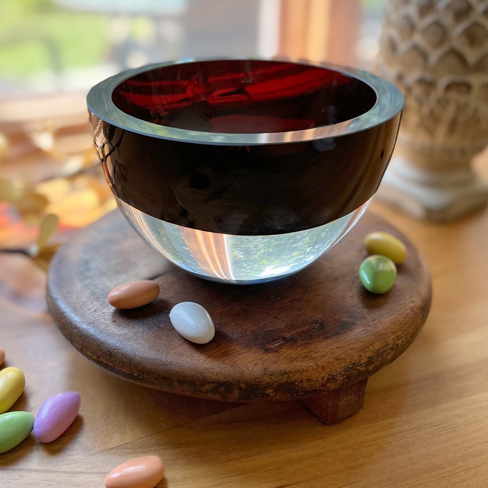 Heavy and obvious in it's superior quality, this European crystal thick walled 6" bowl is a drop dead gorgeous way to serve candy, nuts, or mints. Filled or not, this piece is just as stunning on its own. Makes a great modern accent to your space. A piece of art unto itself, this thick sham bowl with color is unique and oozes modern European design influence. 4-inch H x 6-inch W x 6-inch D