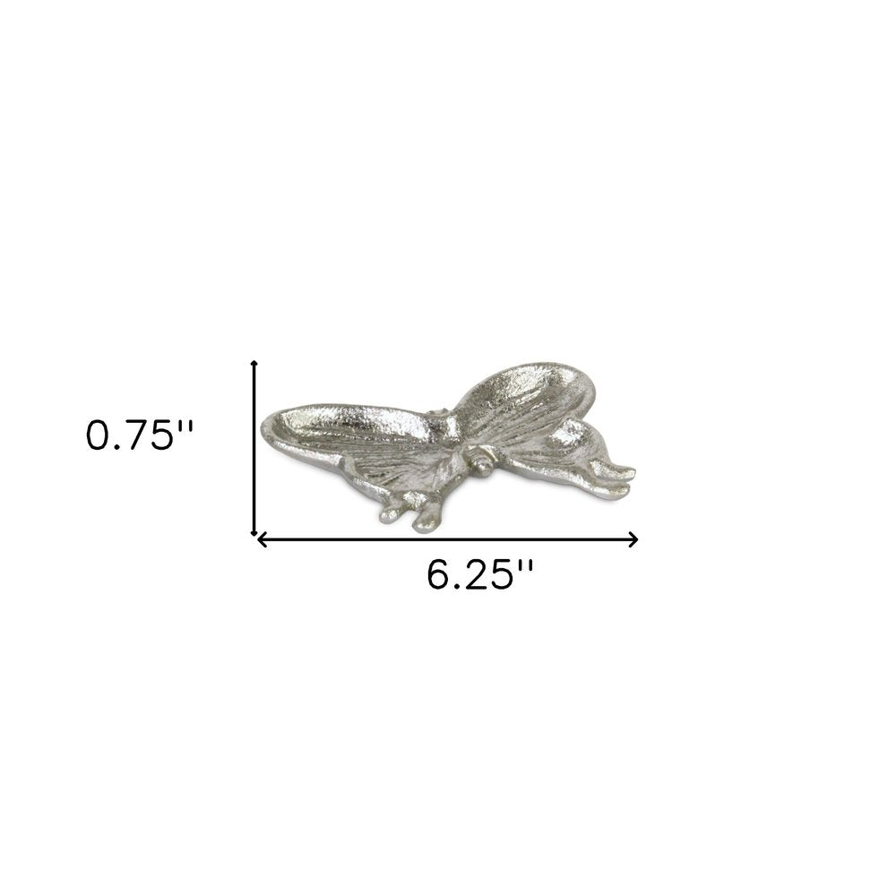 Hand-crafted from cast iron, this butterfly jewelry or trinket tray in a glamorous silver hue is handmade to add a touch of modern elegance to your space. Perfect for holding your keys, coins, jewelry and more. Makes a great gift or chic addition to any room. This nature inspired dish will make an eye catching accent and is a an ideal choice for displaying your prized possessions with style. 0.75-inch H x 6.25-inch W x 4.75-inch D