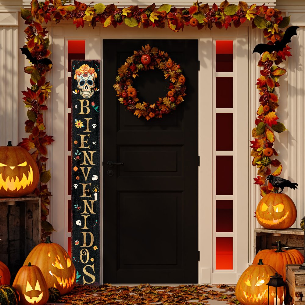 72" Black Gold And Orange Solid Wood Bienvenidos Skull Porch Sign