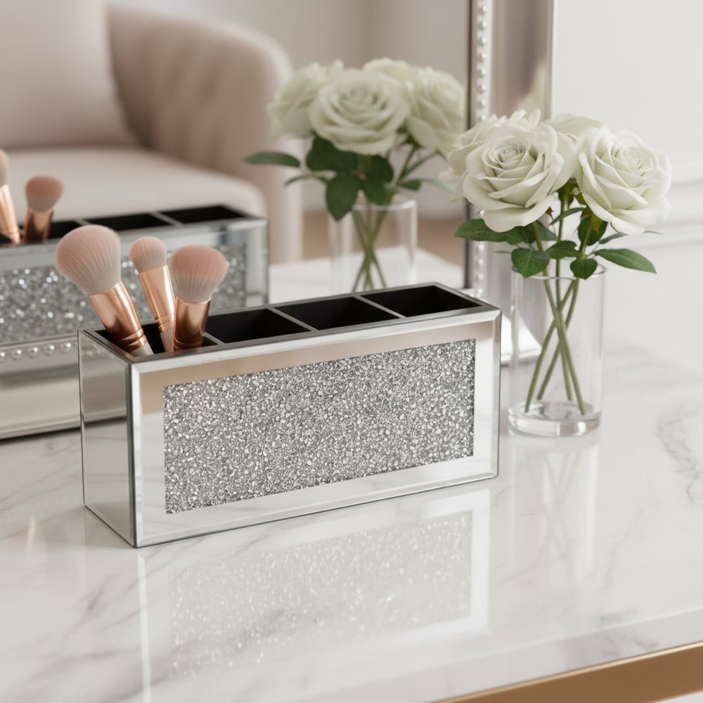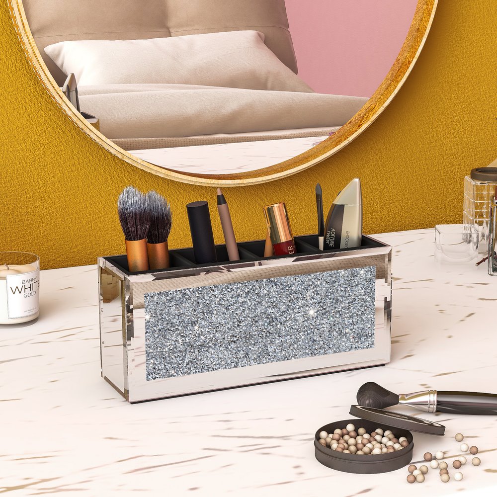The 9-inch silver mirrored glass four section jewelry organizer with faux crystals is the perfect addition to any bedroom. Crafted from stunning mirrored glass, this glam jewelry organizer reflects elegance and sophistication. Its silver finish adds a touch of luxury, making it an eye-catching piece on your tabletop. Designed in a sleek rectangle shape, it offers four spacious sections to neatly store and display your favorite accessories. The faux crystal accents provide a dazzling detail that enhances its overall aesthetic, transforming a practical item into a decorative statement. Keep your jewelry organized and easily accessible while adding a chic flair to your decor with this beautifully designed organizer. 3.94-inch h x 9.20-inch w x 2.76-inch d.