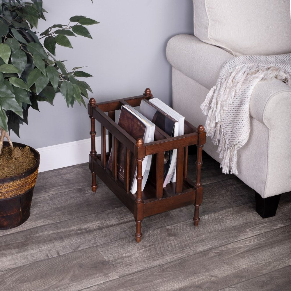 Add a touch of history with this vintage styled Antique Cherry Magazine Basket. Manufactured from Mahogany wood solids, and Mahogany veneer it features of a beautiful framework of slatted sides and baluster spindled posts that also incorporates a divider for better organizing. The cherry wood finish makes it fashionable and functional to enhance any type of decor, be it classic or modern. 17" x 17" x 11"