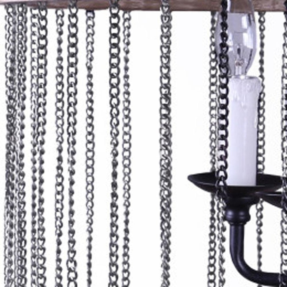 Dress up your entryway, dining room, kitchen, or bedroom with this black and natural wood and metal cylinder six light dimmable chandelier. With a unique shape and style that combines rustic and distressed natural wood in a horizontal cylindrical shape with chains that surround a six light candelabra, this light fixture gives off a modern and updated vibe. Get creative and change up the look of any room with this gorgeous upscale casual hanging light fixture. 23.00-inch h x 26.00-inch w x 26.00-inch d.