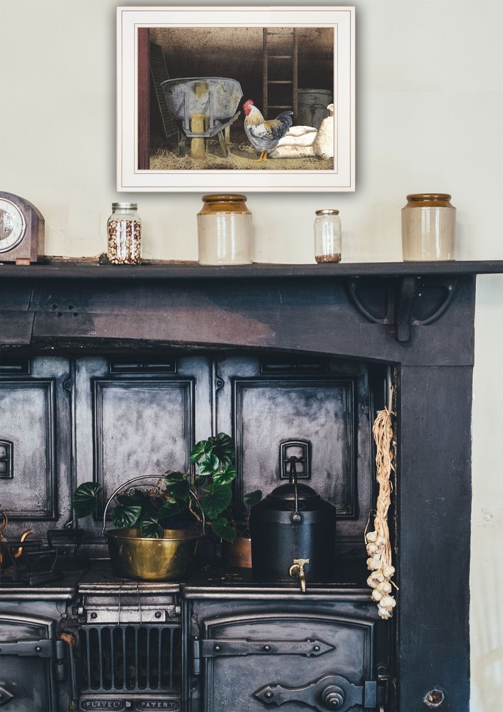 This chicken feed 1 white framed print wall art will add a beautiful decorative accent to your decor. Bring a little bit of the farm indoors when you hang this rooster artwork. This print is a visual artistic expression that allows you to decorate your space in style. Reproduced for you on paper, this hanging decorative accent will be a trendy and fashionable way to dress your walls. Adding this hanging wall art to your space to make your room feel more finished and attractive. Utilize this opportunity to create a focal point in the room with this fabulous wall decor option. 15 inches H x 19 inches W x 1 inches D