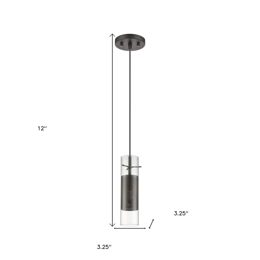 Add some modern design to any room with this Glass and Bronze Mesh Shade Hanging Light. The ceiling bracket has a simple round shape and a bronze finish. There is a thin and taut bronze wire attaching the bracket to the main light. The main light has a narrow bulb holder which is encased in a two-layer shade. The first layer is a wire mesh shade in a bronze finish and the second layer is a cylindrical glass shade. This unique yet minimalist light will look great as a statement light in your bedroom, your living room, or even your kitchen or dining spaces. 12" H x 3.25" W x 3.25" D