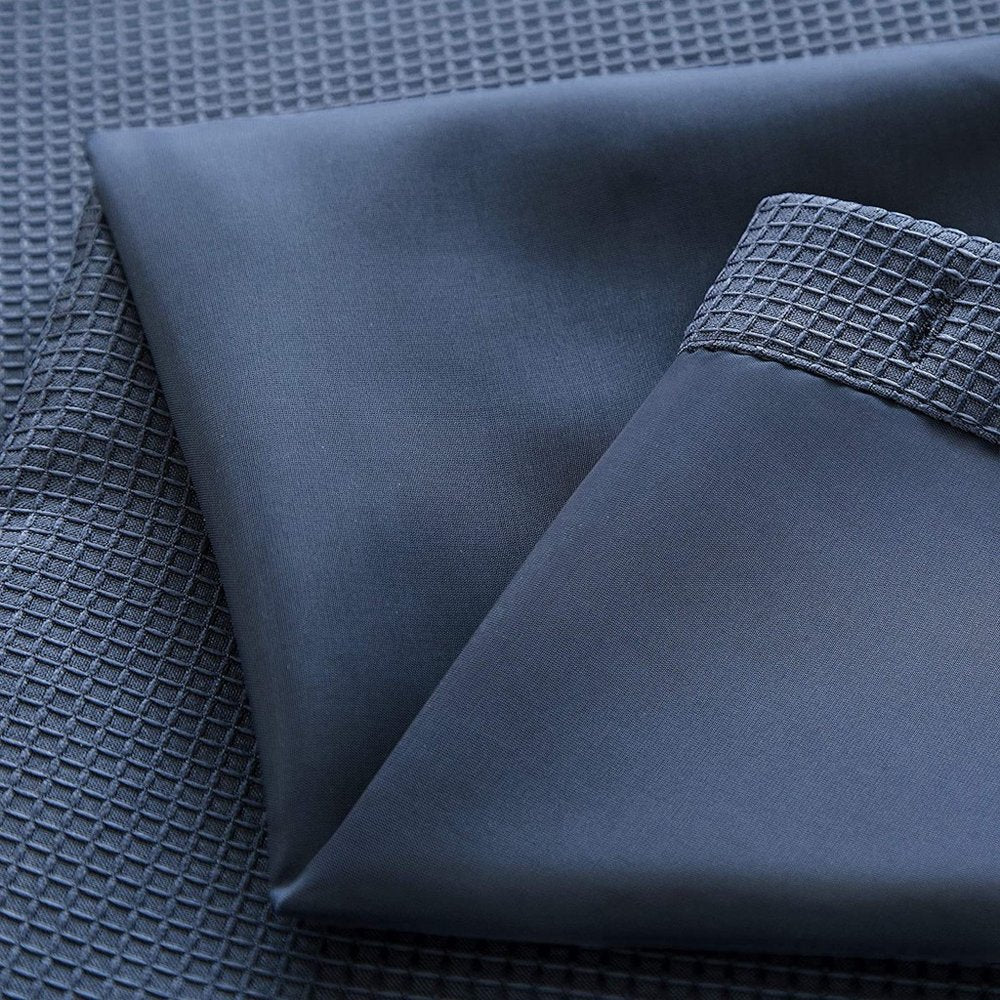 Standing out in fashion and function, this Navy Modern Grid Shower Curtain and Liner Set will be an alluring piece of decorative accent for your bathroom space. The deep navy blue tone of the curtain looks absolutely gorgeous and serves as a practical accent in the bathroom while evoking a sense of confidence and relaxation in the atmosphere. This easy-to-clean cotton shower curtain comes with a liner that keeps water in the tub rather than splashing outside the shower area while preventing mildew on the curtains. You can seamlessly attach the liner to the curtain when needed and snap it off for easy cleaning. Bring home this luxurious shower curtain and liner set to enhance the aesthetics of your contemporary bathroom space with style and grace. 70” x 72”
