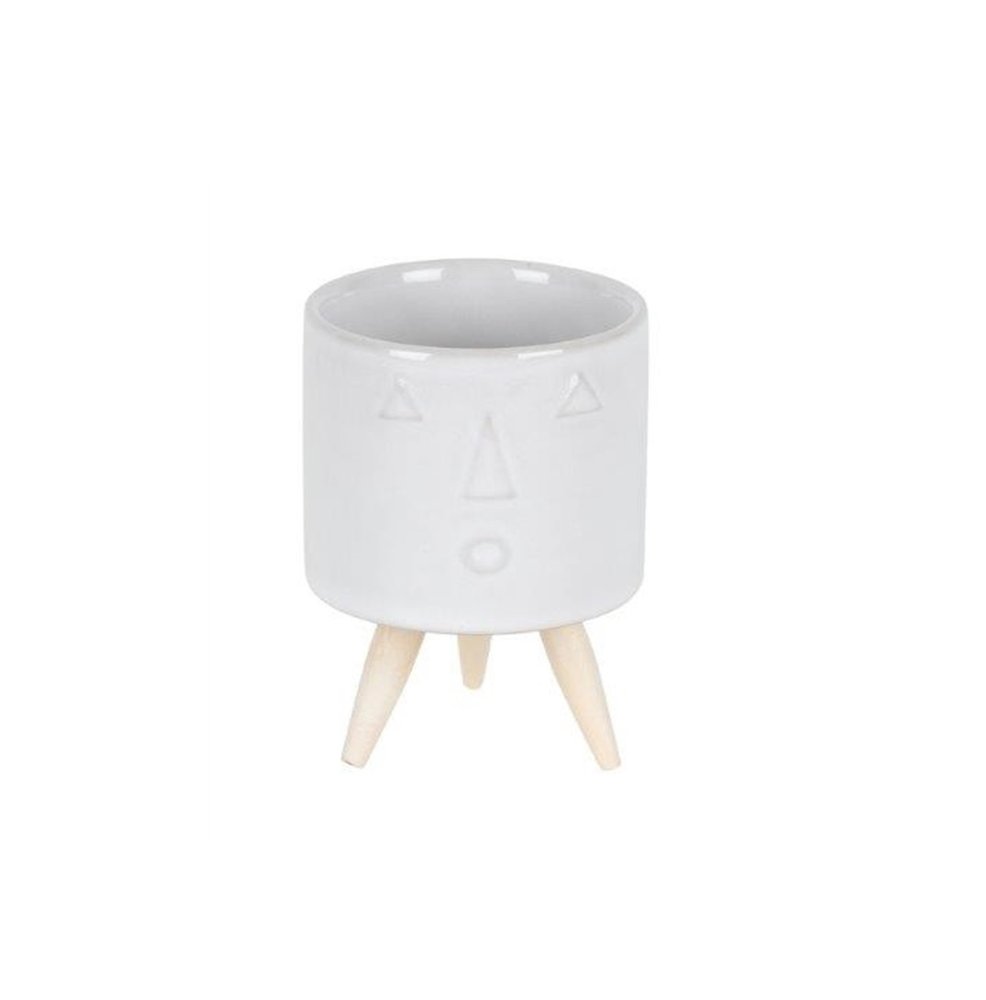 Set of three white porcelain 1 ounce round funny face pot planters with stands brings a delightful touch to your indoor space. Crafted from high-quality porcelain, these pot planters showcase a modern aesthetic that fits effortlessly into any décor. Each planter features a unique funny face design, adding a playful element to your home. Perfect for small plants or succulents, these planters each have three wooden legs and are finished with a creamy white reactive glaze. With three planters included, you can create a cohesive display on shelves, tables, or windowsills, enhancing your indoor gardening experience while infusing character into your living environment. 4-inch h x 3-inch w x 3-inch d.