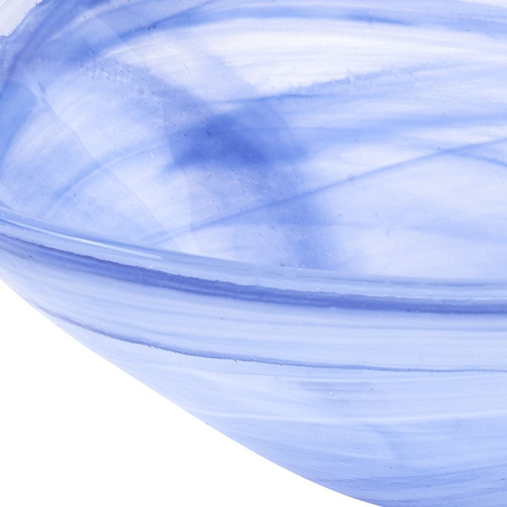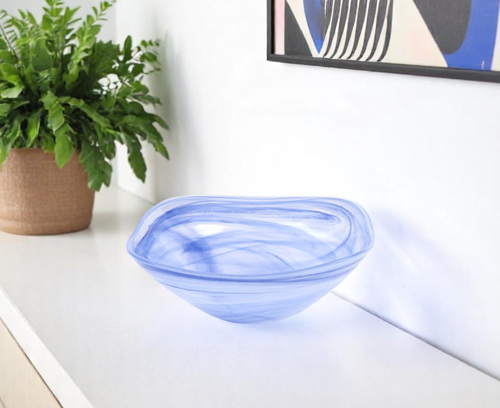 Set of two 6-inch blue and white alabaster glass square candy or nut bowls offer a stylish addition to your tabletop. European handcrafted from high-quality alabaster glass, these bowls showcase exceptional artistry and attention to detail. Designed in a soft corner square shape, they will enhance the presentation of whatever you choose to fill them with; or create a striking decorative display on their own. Elevate your entertaining experience with this exquisite serving bowl duo. 2.5-inch h x 6-inch w x 6-inch d.