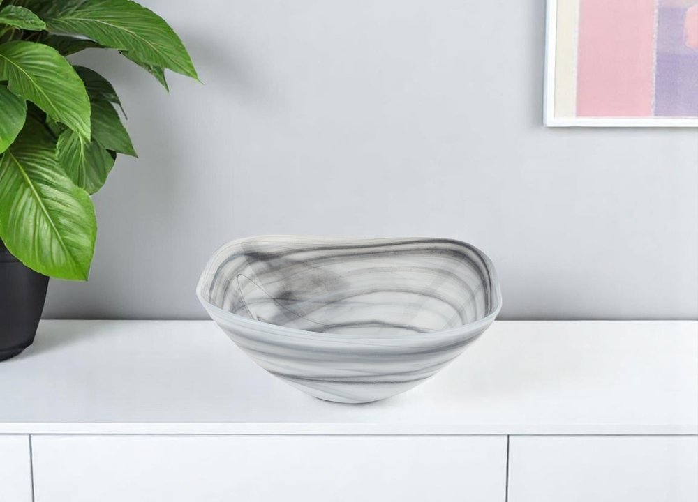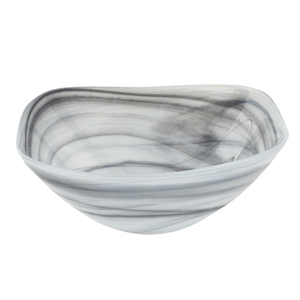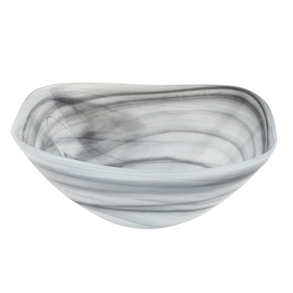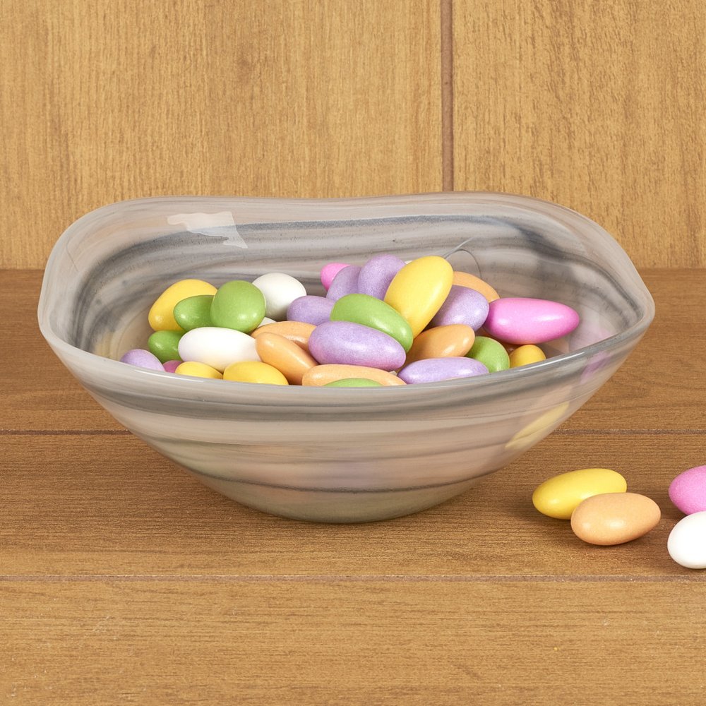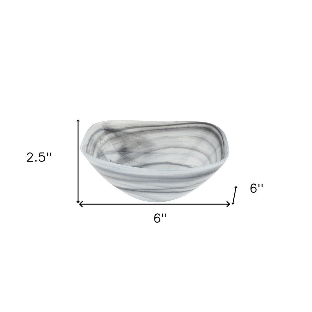 Set of two 6-inch gray and white alabaster glass square candy or nut bowls adds a touch of elegance to any table setting. European handcrafted from high-quality alabaster glass, these bowls showcase exceptional artistry and attention to detail. Designed in a soft corner square shape, they will enhance the presentation of whatever you choose to fill them with; or create a striking decorative display on their own. 2.5-inch h x 6-inch w x 6-inch d.