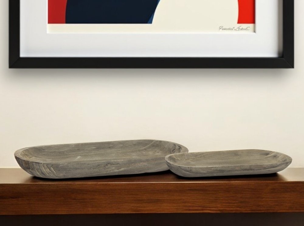 Crafted from durable solid wood, this set of two oval serving trays in a natural brown hue offers a traditional touch to your decor. The worn faded distressing adds character to the pieces, making them perfect for serving or display. Each tray can be used individually or together, providing versatility to your styling options. Elevate your hosting game with this elegant set that effortlessly combines style and functionality in a seamless design. 2.5-inch H x 9.75-inch W x 23.75-inch D