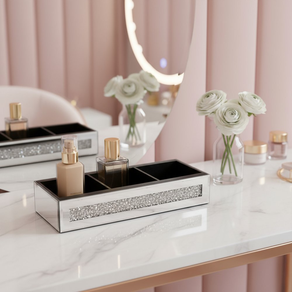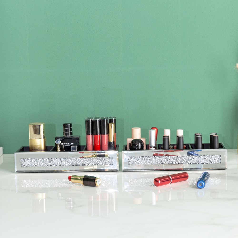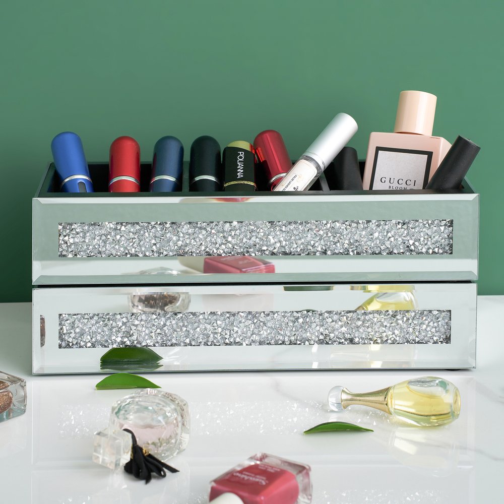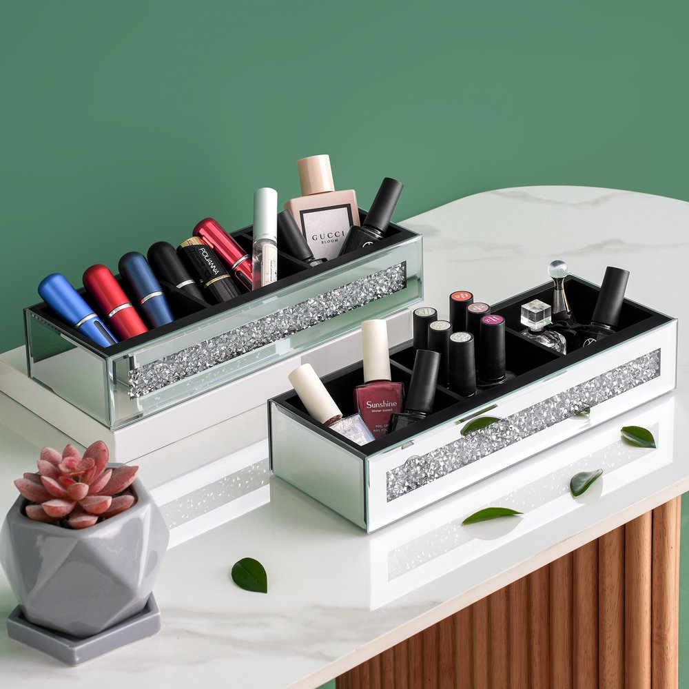 The set of two silver mirrored glass three section jewelry organizers with faux crystals elegantly combines functionality and style. Crafted from luxurious mirrored glass, this exquisite jewelry organizer adds a touch of glam to your bedroom decor. The sleek silver finish enhances its modern appeal, making it a perfect tabletop addition. Featuring three sections, it provides ample space for all your treasured pieces, ensuring they are organized and easy to access. This set includes two stylish organizers, allowing you to create a coordinated look while maximizing storage options. Enhance your space with this beautiful and practical solution for displaying and protecting your jewelry collection. 1.97-inch h x 9.80-inch w x 3.70-inch d.